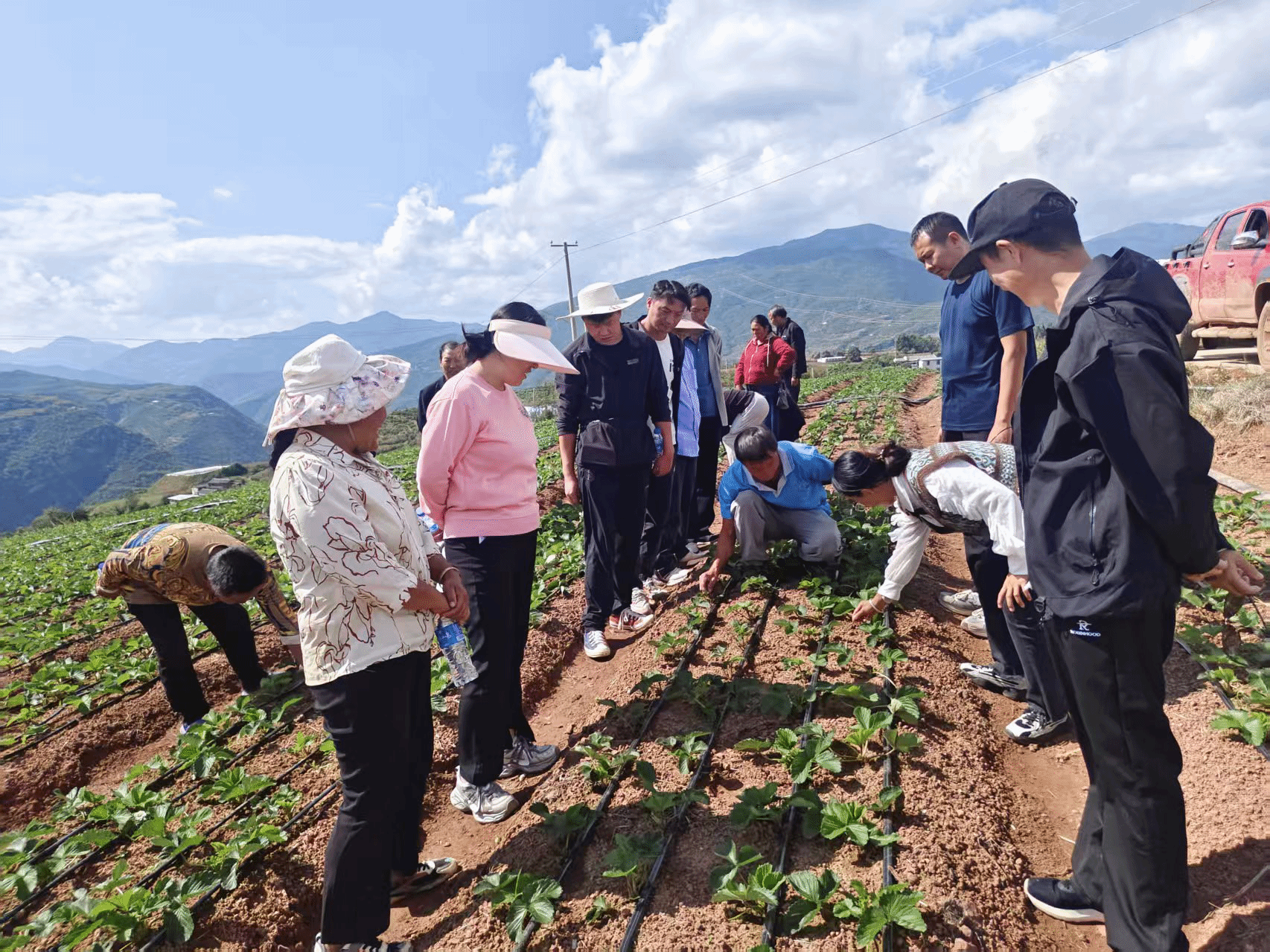 二是设置田间实操,促技术落地。为避免“纸上谈兵”,培训特别设置田间实操环节,现场示范疏叶疏果、匍匐茎处理、老叶病叶识别与清除、蜜蜂授粉辅助管理等实用技术。通过“一看、二听、三动手”的模式,使抽象的理论知识转化为直观的操作技能。培训期间,共发放《草莓中耕管理技术手册》《药剂使用指南》各550套。搭建 “乡土人才+技术员+种植户” 的长效交流平台,建立“宜就镇草莓种植技术服务”微信群,将87%的参训户纳入线上指导体系,推送中耕操作视频教程5个,实现技术指导“不断线”。