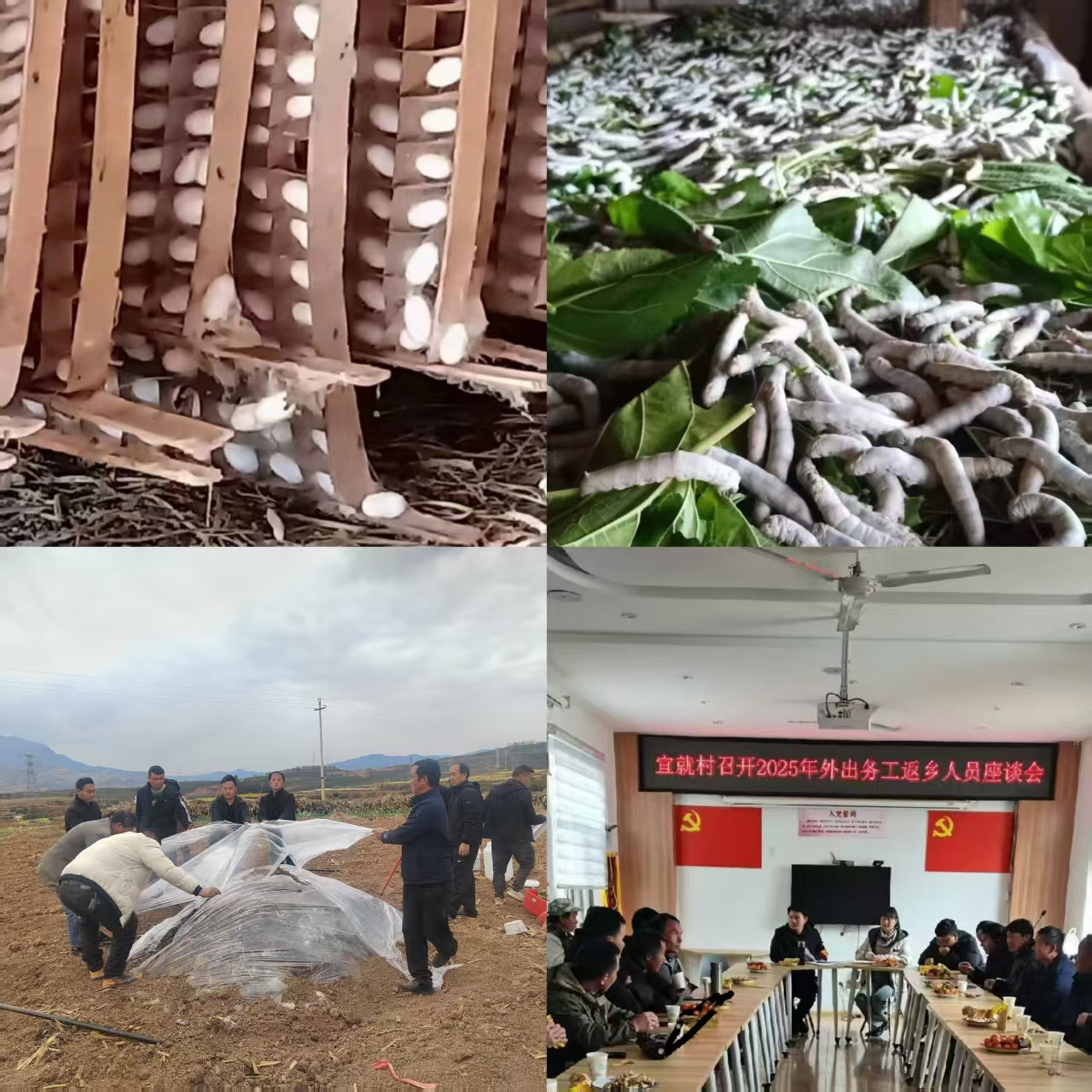 其他产业齐抓管,群众增收渠道得拓宽。烟草产业“压舱石”“稳定器”作用更加突显。2024年实现烤烟产值155万元,户均收入达6.2万元,收购均价达31元。2024年全村春季养蚕95张,夏季养蚕143张,秋季养蚕163张,晚秋养蚕171张,冬季养蚕120张,共计养蚕692张产量27680公斤产值166万元。2024年全村务工人数合计2047人(次),包括省外务工人员、省内务工人员、县内务工人员及乡内务工人员,其中:跨省就业人数318人,省内就地转移就业人数510人,县内乡外就近转移就业459人,本乡镇内打零工等合计760人。技能培训3个班次15天160人,每人每天生活补助交通补助80元,提供乡村公共服务岗位29个岗位。