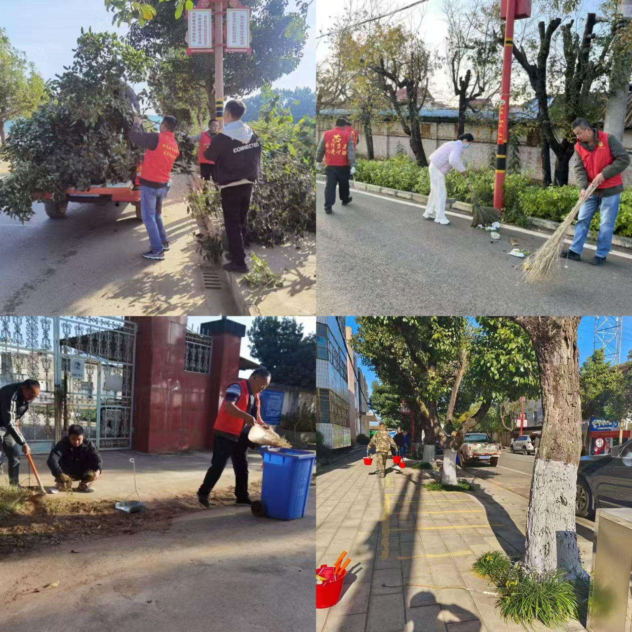 上午八时,志愿者带着扫帚、镰刀、锄头、火钳等保洁工具,集中认领任务。进行简单分工后,3个组的志愿者分头开始清理集镇区。在街道两侧,大家为行道树修枝整型,清走树枝,并将树干涂上石灰,防止虫害。在街边花园,大家认真清除杂草、清理白色垃圾。在各商铺门前,相关工作人员一一上门收取垃圾清运费。整个活动中,大家积极号召个体经营户也参与卫生整治,清扫卫生死角。