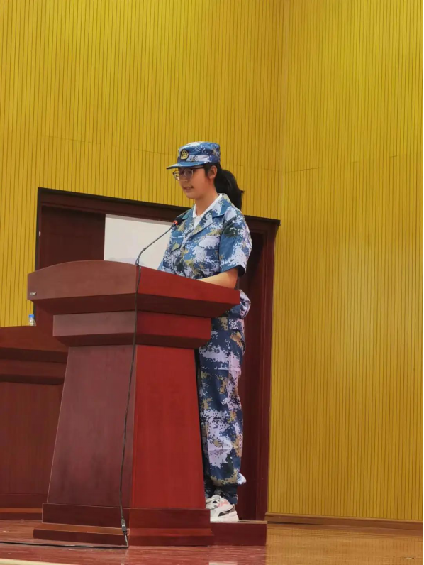 初二217班殷瑜同学作为学生代表发言,表示在充满挑战的训练中,要学会忍耐坚强、服从纪律、超越自我、互帮互助、严格要求自己,希望能与各位同学、教官结下深厚的友谊,以优异的成绩向母校致敬。