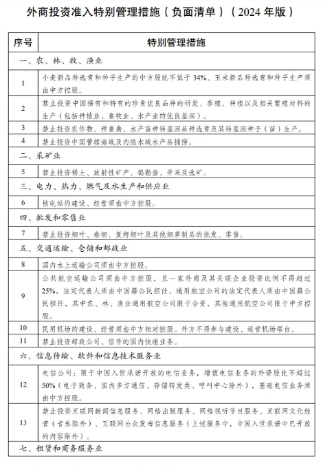 《外商投资准入特别管理措施(负面清单)(2024年版)》已经2024年4月8日国家发展和改革委员会第10次委务会议审议通过和商务部审签,并经党中央、国务院同意,现予发布,自2024年11月1日起施行。