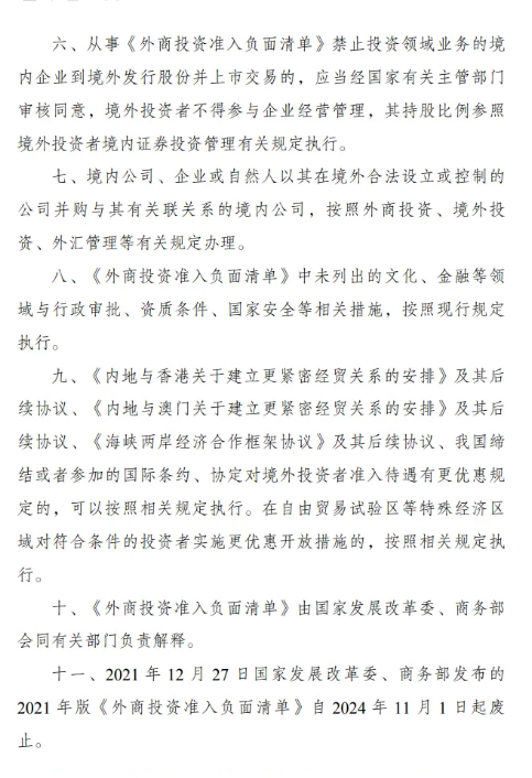 经党中央、国务院同意,国家发展改革委、商务部于2024年9月8日发布第23号令,全文发布《外商投资准入特别管理措施(负面清单)(2024年版)》,自2024年11月1日起施行。《外商投资准入特别管理措施(负面清单)(2021年版)》同时废止。