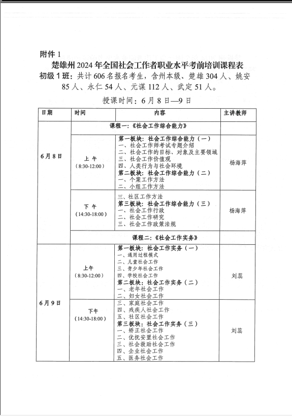 附件:1.楚雄州2024年全国社会工作者职业水平考前培训课程表