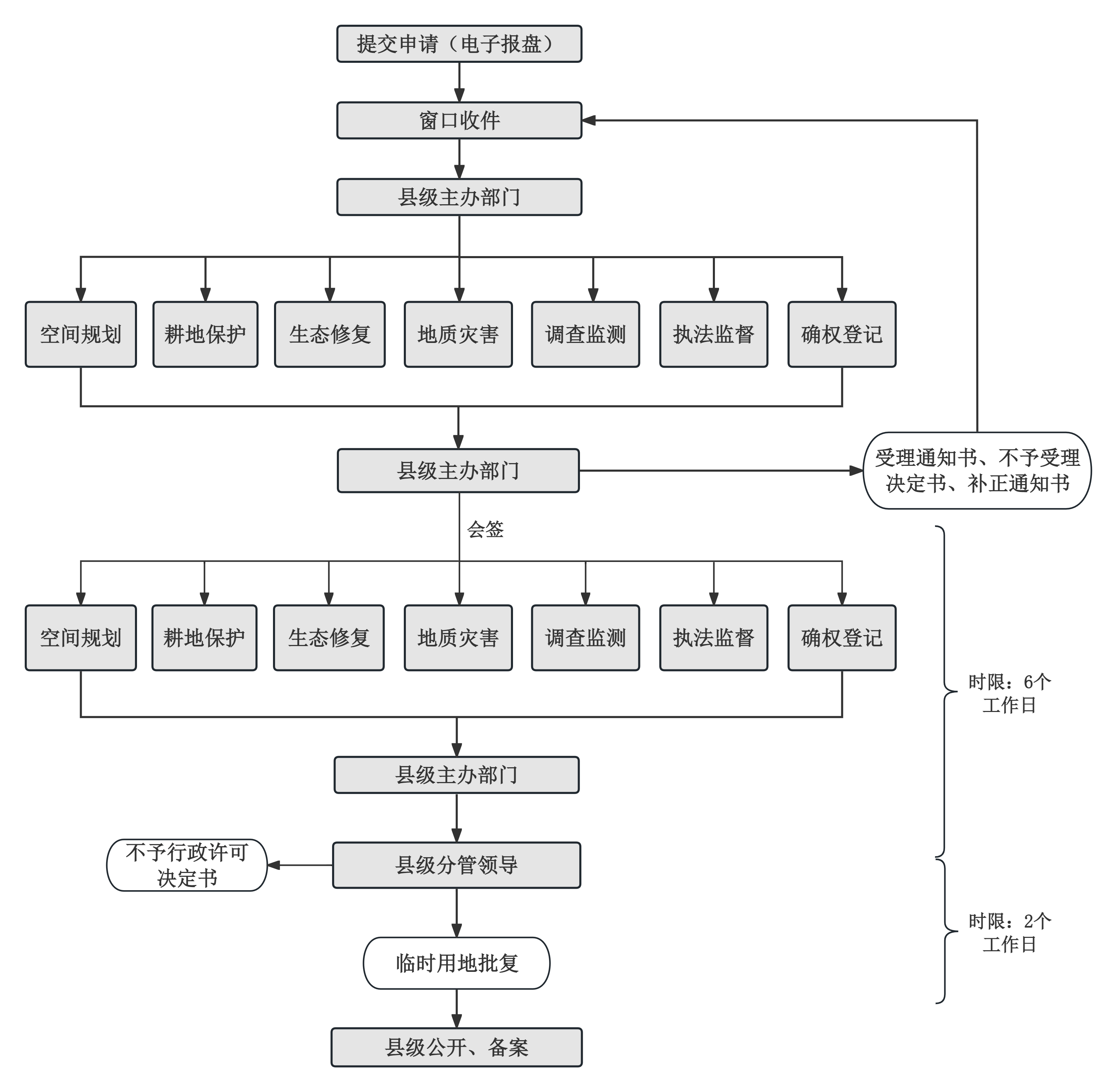 审核会签阶段:下发《受理通知书》后,进入审核会签阶段,各部门进行审核,完成审核会签。审核通过,经分管领导批准后,下达临时用地批复,并做好信息公开及自然资源部临时用地信息系统备案;审核不通过,经分管领导批准后,下发《不予行政许可决定书》。各部门审核会签时间不超过6个工作日,分管领导签批时间不超过2个工作日。