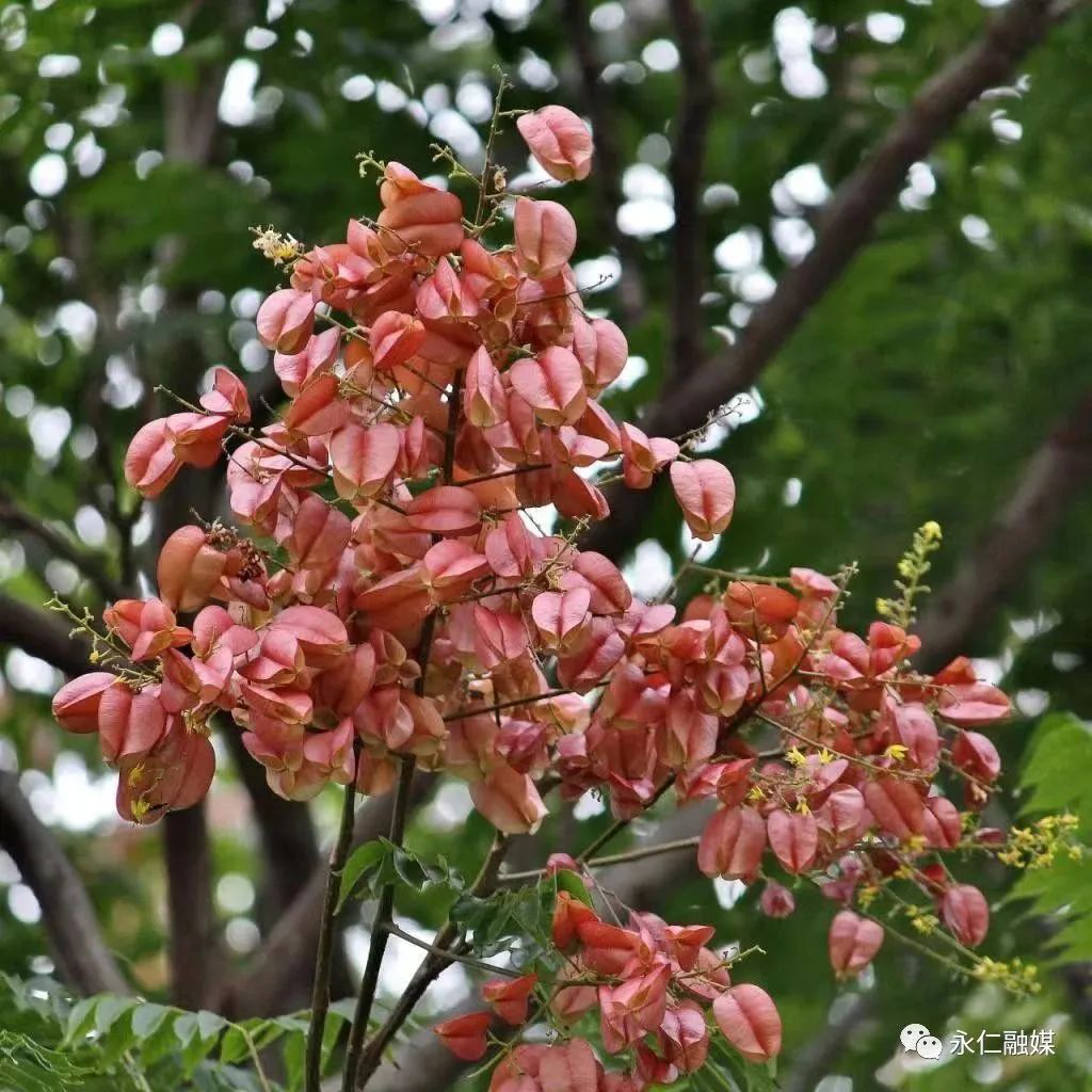 栾树的花语是“奇妙震撼,绚烂一生”,它的观赏期十分长,春季叶片嫩红可人,夏季黄花开满树,而到秋季时,一盏盏火红的小灯笼悬挂枝头,美丽多彩。