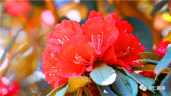 5、马缨花(拉丁名:Rhododendron delavayi Franch.):也称马缨杜鹃,为杜鹃花科杜鹃花属常绿灌木或小乔木,高1-7米,树皮淡灰褐色;幼枝粗壮,顶生冬芽卵圆形,淡绿色;叶革质,长圆状披针形,上面深绿至淡绿色,下面有白色至灰色或淡褐色;顶生伞形花序,圆形,紧密,有花10-20朵,花冠钟形,长3-5厘米,直径3-4厘米,肉质,深红色,裂片5,近于圆形;蒴长圆柱形,黑褐色;花期5月,果期12月。生于海拔1200-3200米的常绿阔叶林或灌木丛中,该物种因花朵美丽,颜色鲜艳,人工栽培,具有较高的园艺价值;全县境内均有分布。