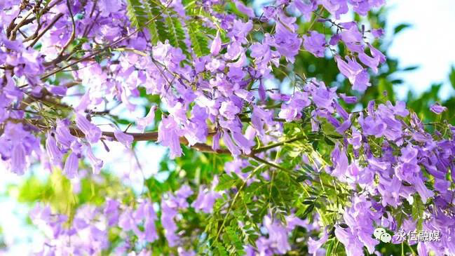 2、蓝花楹(拉丁名:Jacaranda mimosifolia D. Don):是紫葳科、蓝花楹属落叶乔木,高达15米。蓝花楹性喜阳光充足和温暖、多湿气候。蓝花楹是观叶、观花树种,蓝花楹可以在公园中进行孤植,可以作为行道树栽植,也可以作为庭院特色树种进行利用。蓝花楹可以用于制造家具和造纸。蓝花楹树干通直,棕色木质,质软,易于加工,是制作家具和木雕工艺品的好材料。蓝花楹性喜阳光充足和温暖、多湿气候,要求土壤肥沃、疏松、深厚、湿润且排水良好,低洼积水或土壤瘠薄则生长不良。不耐寒。若冬季气温低于15℃,则生长停滞,若低于3-5℃会发生冷害,夏季气温高于32℃,生长也会受到抑制。