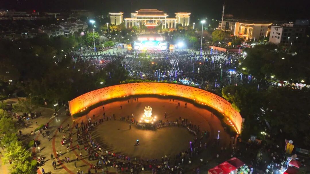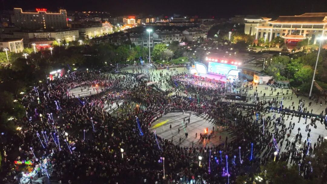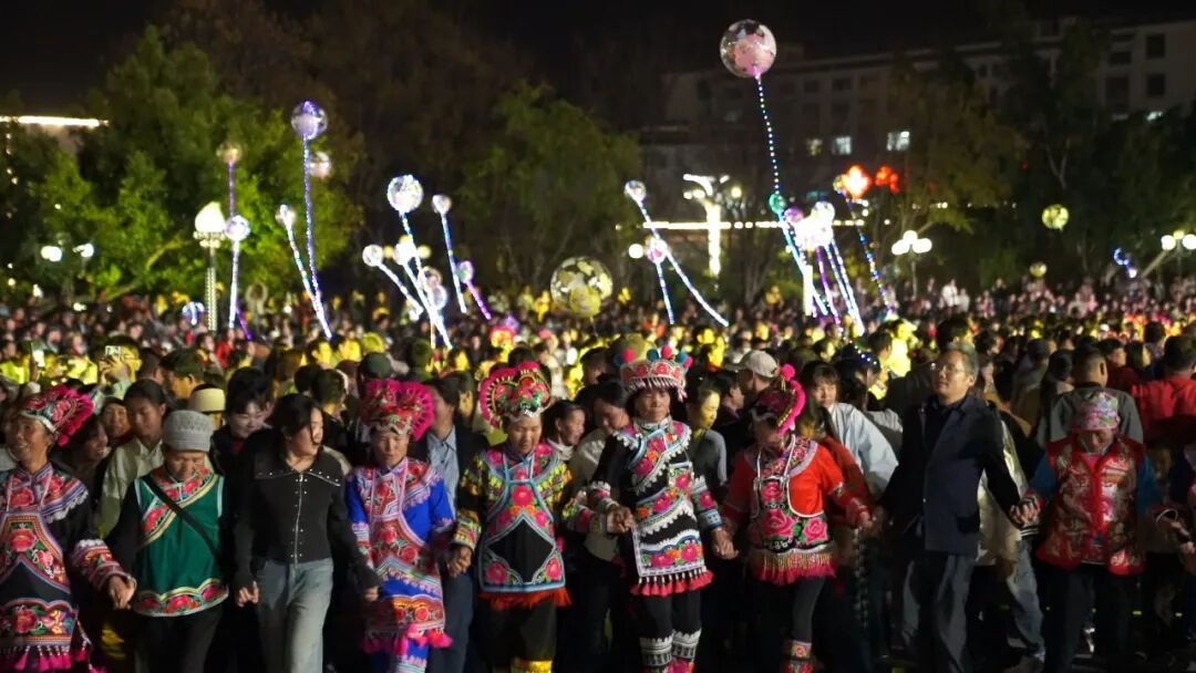 伴着欢快激昂的彝族奏乐,身着五彩盛装的当地群众与来自全国各地的旅居游客,手牵着手、肩并着肩,上万身影踩着欢快节拍,纵情打跳欢歌,沉浸式体验千年赛装的独特魅力与节日温情,熊熊燃烧的篝火点亮元宵之夜,映照着张张笑脸,呈现出各族民众共庆团圆、亲如一家的动人画卷。
