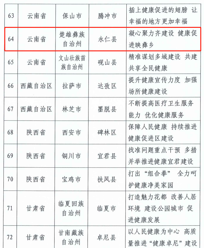 全国共入选健康县区建设优秀案例81个,永仁县榜上有名。