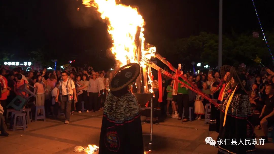 夜幕降临,在民族文化广场,随着相约永仁·火把盛典暨主题晚会文艺演出的开启,首先是彝族传统而庄重的祭火仪式,德高望重的毕摩师念诵起了祭祀火神的毕摩经,毕摩点燃象征吉祥、幸福的火种,祈福风调雨顺、五谷丰登、国泰民安。随后毕摩点燃火把,并传递到舞台两侧,点燃主火把。昭示永仁传统文化血脉薪火相传,源远流长,熊熊的火焰也预示着永仁各民族的团结和社会的和谐。