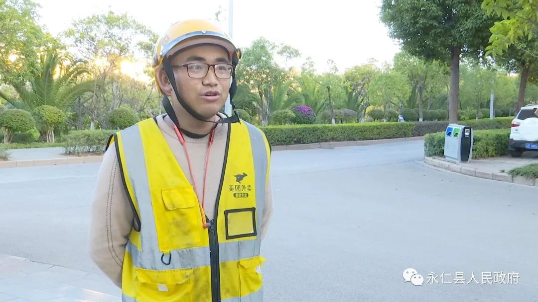 美团外卖骑手 邓宇城说:“作为一名外卖骑手,在今后的工作中,我们会遵守交通法规,戴好头盔,不抢道,不飙车,文明驾驶,安全出行。”