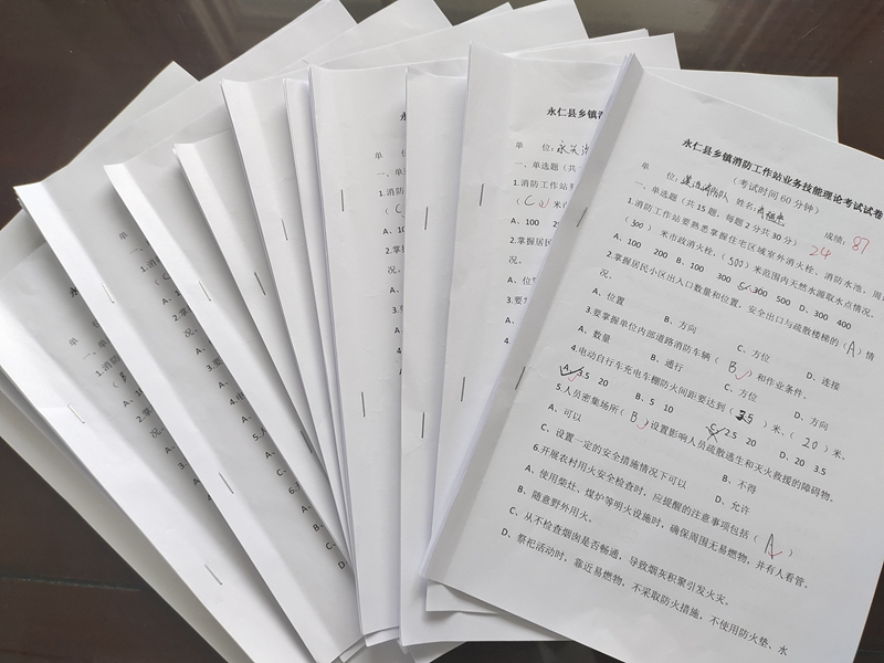 理论考试验成效。培训结束,大队组织全体参训人员进行理论考试,检查培训成效。试卷紧扣培训内容,设置单选题、多选题、判断题、解答题。单选题聚焦消防基础概念、法规常识,如乡镇消防队伍职责、火灾报警流程等;多选题考查消防设施多元操作规范,火灾隐患排查重点等;判断题围绕消防工作常见误区;解答题围绕日常消防工作怎样开展。通过严格闭卷考试,全面检验成员对理论知识的掌握程度,帮助参训人员查找学习薄弱点,明确仍可深化理解的消防业务板块,为后续实操训练筑牢知识支撑。