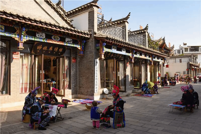 老街上商铺林立,多以展示非遗项目为主,经营着彝绣、苴却砚、羊皮褂、根雕及民间乐器等独具特色的文化旅游产品。同时,提供民间器乐传习、演奏等服务,文化氛围浓厚、地方特色鲜明,游、娱、购都十分方便。
