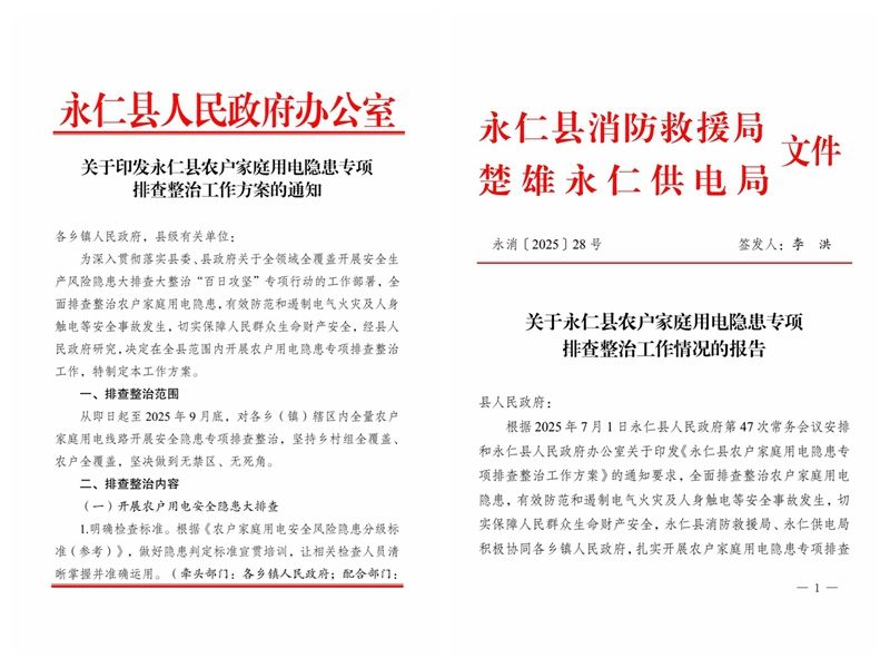 组织化治理。县乡各级党委政府组织召开农户用电隐患排查动员会,县消防救援大队和永仁供电局密切配合,协助各乡镇开展隐患判定标准及安全用电的专题培训,安排专人到村委会配合开展农户用电隐患排查现场指导;县政府督察室先后3次深入各乡镇进行督察,对督察发现的问题及时下发督察通报,要求限期整改;县政府主要领导定期调度农村用电隐患排查工作,组织召开会议进行分析研判,及时解决相关问题。
