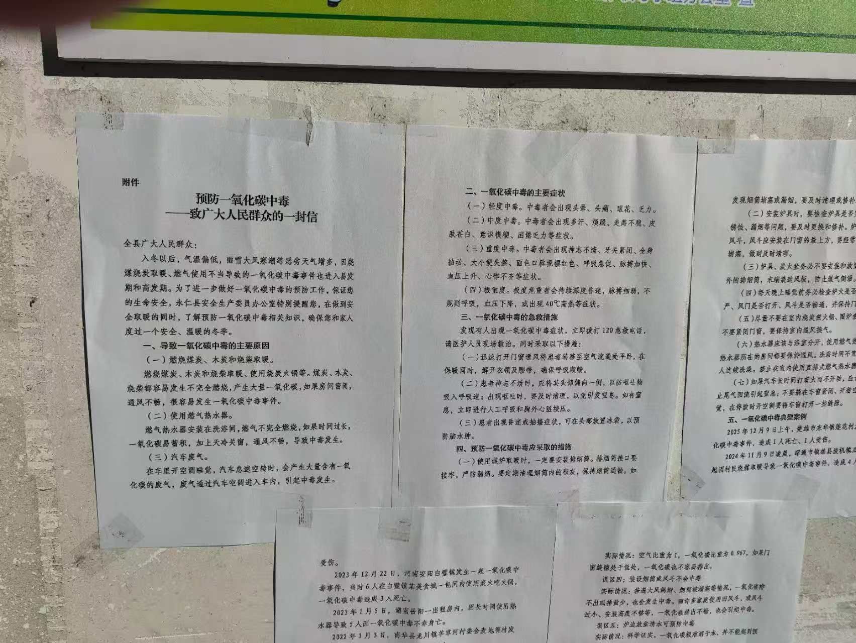 二是加强重点区域宣传。把全县的《预防一氧化碳中毒—致广大人民群众的一封信》以宣传单形式在森林管护点、森林防火瞭望台,林区施工单位、涉林草住宿小区,县林草局网格责任区(县工贸市场)进行了宣传。三是突出重点宣传。把一氧化碳中毒的主要原因、主要症状、急救措施、应采取的措施、典型案例重要内容进行了宣传,截至2026年1月22日,召开会议宣传6场次210人,张贴和发放宣传单108份,微信宣传1100条,全面提高林草干部职工和广大群众安全防范意识,更好地预防事故发生。