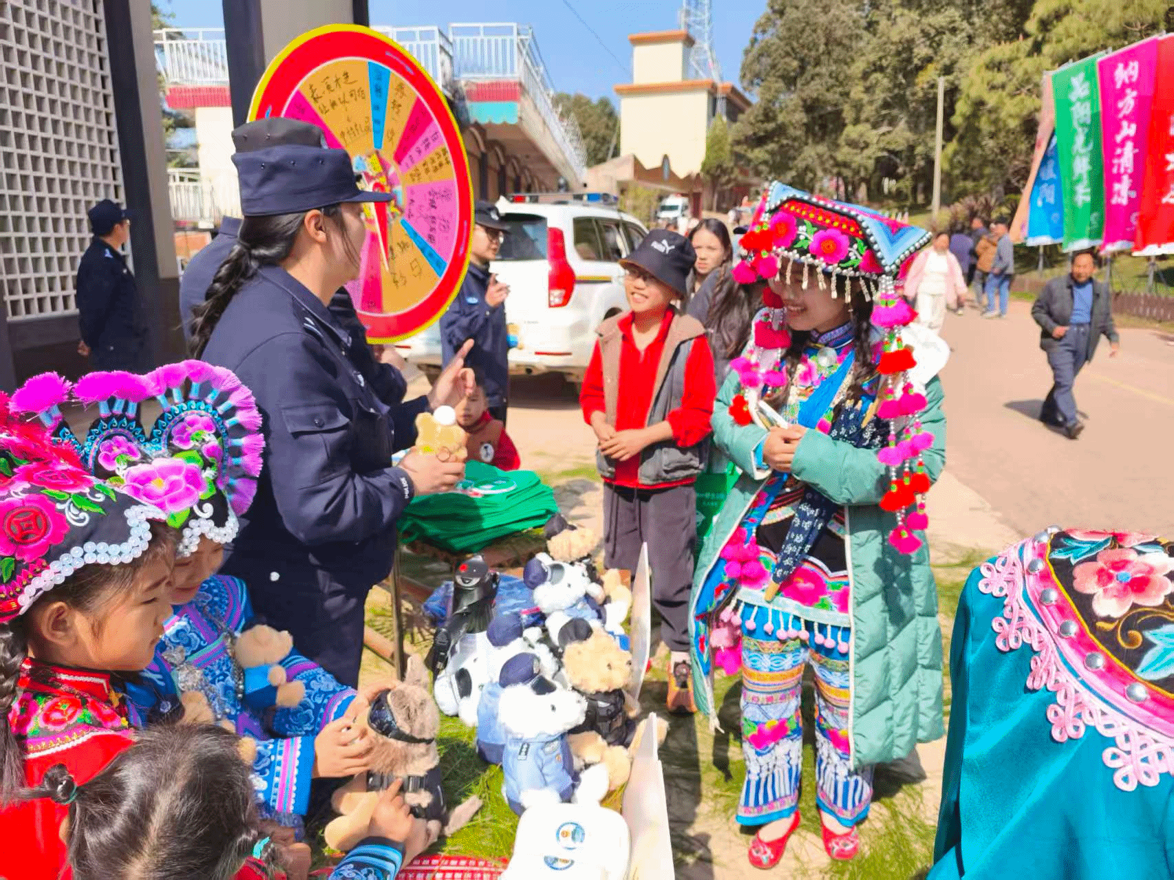 在活动现场,永仁公安的 “反诈小摊” 凭借新颖的互动形式和诚意满满的定制礼品,迅速成为游客争相打卡的 “顶流”。色彩鲜艳的幸运大转盘上,“交通安全问答”“反诈问答”“再转一次” 等趣味任务,让大人小孩都跃跃欲试。