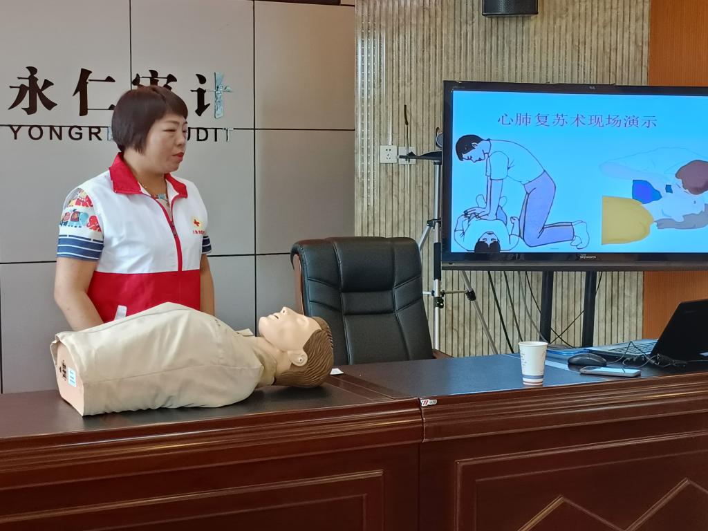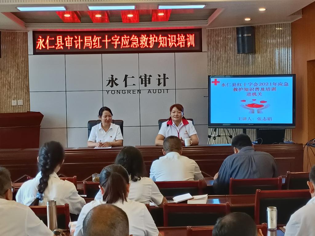 为进一步普及和推广全民应急救护知识,提高审计干部职工的安全防范意识、应急救援和自救互救能力,在学党史、悟思想、办实事中营造出更加安全、健康、和谐的工作和生活氛围,永仁县审计局联合县退役军人事务局于7月5日邀请县红十字会张老师到县审计局开展了现场应急救护培训。