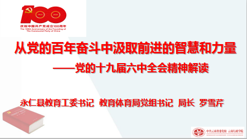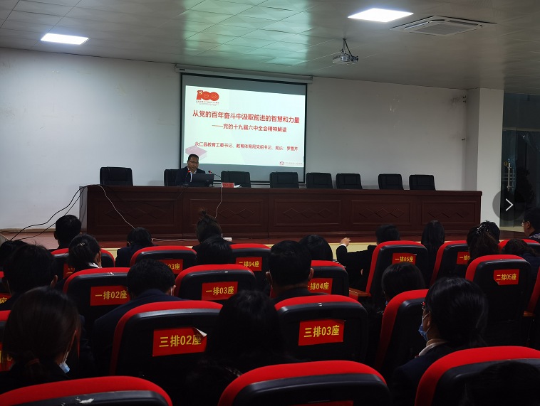 为全面深入学习宣传贯彻习近平总书记在党的十九届六中全会上的重要讲话精神,进一步在全县教育系统掀起学习宣传贯彻的规模和热潮,让习近平总书记重要讲话精神和全会精神在全县教育系统落地见效、遍地开花,12月17日19:30永仁县教育体育局在永仁县委党校组织开展了十九届六中全会精神专题宣讲,由永仁县教育工委书记、局长罗雪芹主讲。县民族中学、民族小学、局机关全体干部职工,各公办校园长、书记、副校长、纪检室主任、各民办幼儿园全体教职工参加了会议。