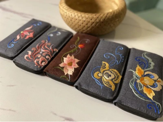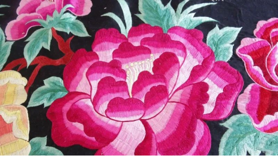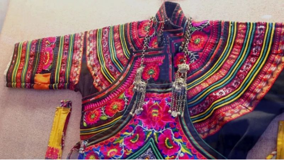 同一朵花,在不同的绣娘眼里,能变形为不同的图样,每一件绣品就是一个人情趣、情志的缩影,并呈现了对自然的眷恋。服饰底色多为黑、蓝、红,分别代表着黑夜、蓝天和太阳,增添原始韵味。