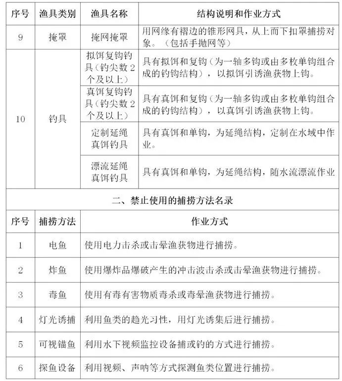 云南省长江流域禁捕水域禁止使用的渔具和捕捞方法名录