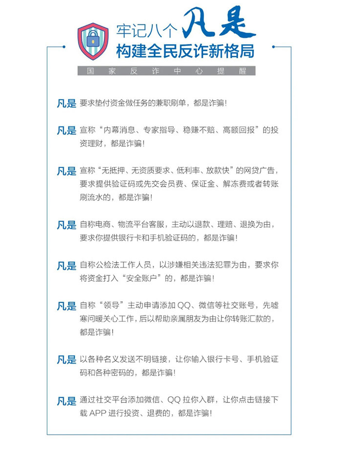2.牢记“八个凡是”和“三不原则”。凡是要求垫付资金做任务的兼职刷单,都是诈骗!凡是宣传“内幕消息、稳赚不赔、高额回报”的投资理财,都是诈骗!凡是宣称“无抵押、无资质要求、低利率、放款快”的网贷广告,要求提供验证码或先交“会员费”“保证金”“解冻费”或者转账刷流水的,都是诈骗!凡是自称电商、物流平台客服,主动以退款、理赔、退换为由,要求提供银行卡和手机验证码的,都是诈骗!凡是自称公检法工作人员,以涉嫌相关违法犯罪为由,要求将资金打入“安全账户”的,都是诈骗!凡是自称“领导”主动申请添加QQ、微信等社交账号,先嘘寒问暖关心工作,后以帮助亲属朋友为由让转账汇款的,都是诈骗!凡是以各种名义发送不明链接,让你输入银行卡号、手机验证码和各种密码的,都是诈骗!凡是通过社交平台添加微信、QQ拉你入群,让你点击链接、下载APP进行投资、退费的,都是诈骗!