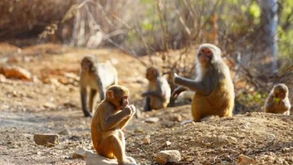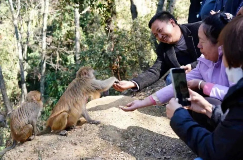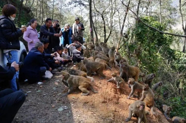 近段时间,山上食物少,猴群便成群结队集结在山坡上打闹嬉戏、互相整理毛发,捡食游客为他们放置的苹果、饼干、面包等食物,萌态十足,非常可爱,构成了一幅自然和谐的生态画卷。