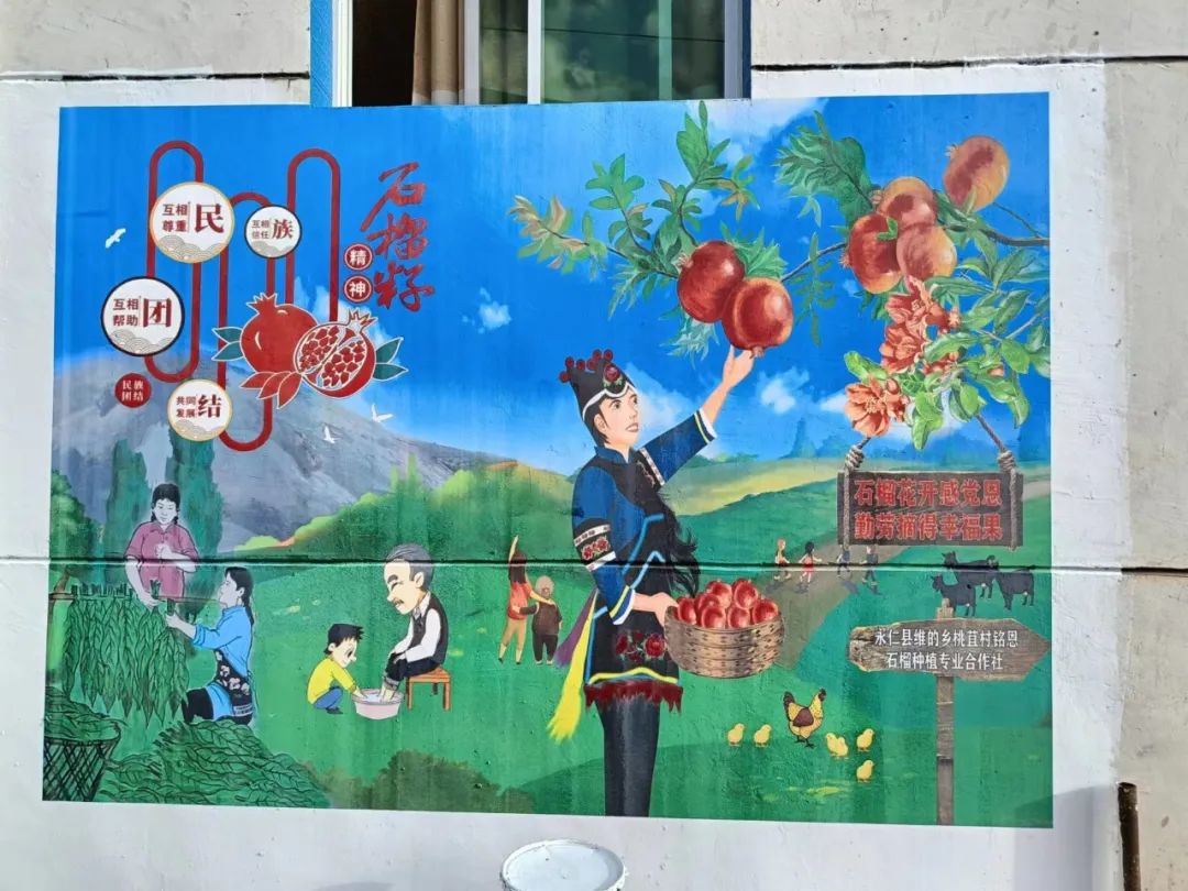 打造农事文化墙。春耕、特色林果等农业元素成为墙画创作的素材,依托维的乡烤烟石榴产业,打造特色宣传文化墙体,在啊吧拉小组打造了4面彩绘墙体,1块红黑评定公示榜,宣传民族团结“石榴籽”精神,展现丰厚乡土文化底蕴,激发浓郁乡风文明气息。