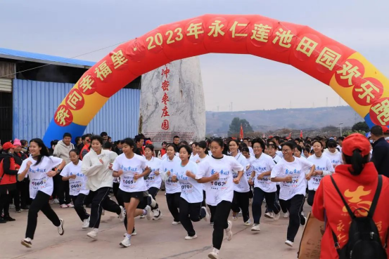 在永仁县莲池乡彝族年“奔向幸福里 田园欢乐跑”吸引了1068名群众参赛。北京奥运会火炬手,云南牛人马亮武参赛领跑。迎着冬至的第一缕阳光,参赛选手沿着永仁县莲池乡乡村大果园4500米田园跑道欢乐奔向终点。