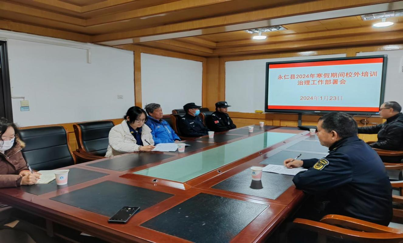 1月23日上午,县教育体育局会同县文化和旅游局、县工信商务科技局、县市场监督管理局、县住房和城乡建设局、县公安局、县消防救援大队,在县教育体育局会议室开展了“永仁县2024年寒假期间校外培训治理工作部署会”,集中学习了教育部、省州关于今年寒假期间校外培训治理的工作要求,明确了我县治理工作的时间表、路线图,要求各职能部门认真履行职责,确保校外培训治理工作取得成效,进一步净化校外培训市场环境,切实减轻学生校外培训负担。