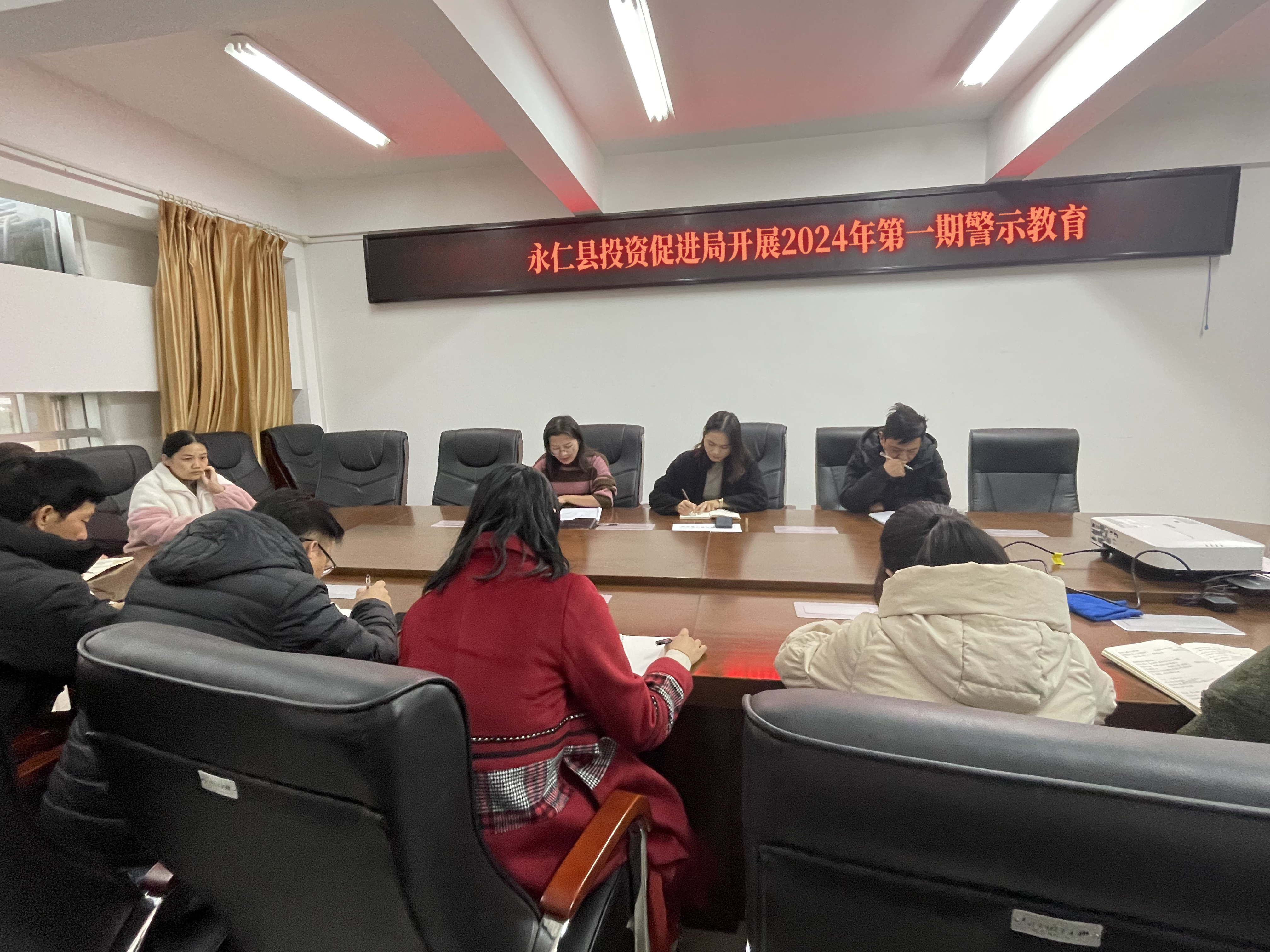 2024年2月6日,永仁县投资促进局召开2024年第一期警示教育大会,全体干部职工集中观看了警示教育专题片《巡“剑”破“风”》1-3集,党支部书记、局长王喜花开展了集体廉政提醒谈话,教育引导广大党员、干部知止知畏、担当尽责。