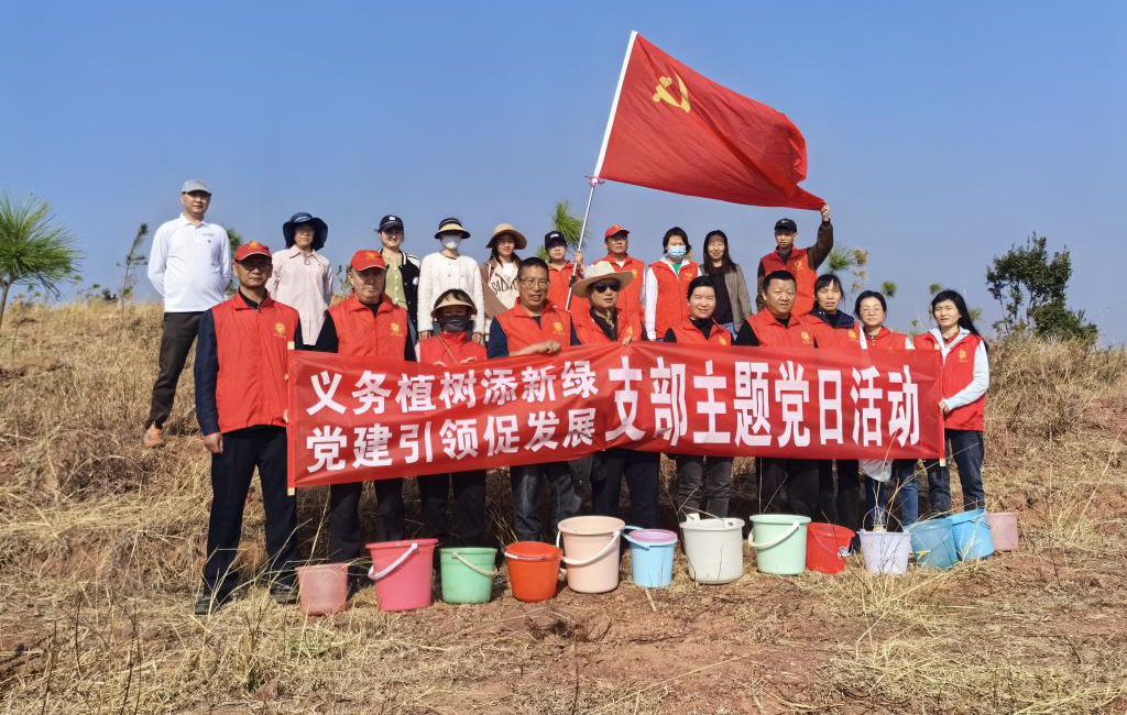 在植树现场,党旗飘扬,志愿者们分工协作、干劲十足,扶苗培土、提水浇灌,呈现出一片热火朝天的劳动景象,以实际行动践行“绿水青山就是金山银山”发展理念,传播“植绿、护绿、兴绿”的文明风尚。