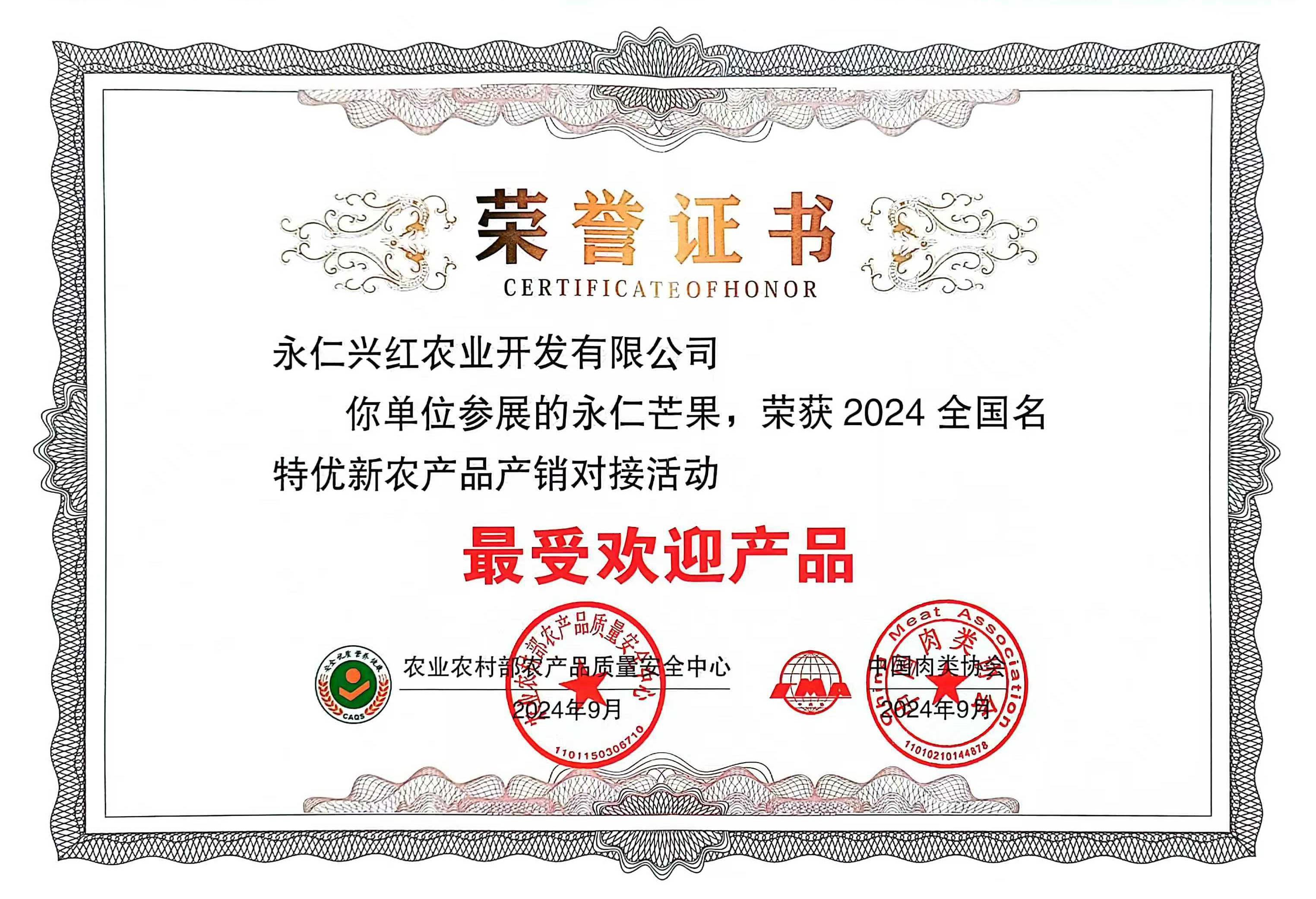 活动期间,永仁芒果、永仁黑板栗特色鲜明,吸引了大量市民、参展商驻足品尝、咨询交流、下单订购。尤其是永仁芒果果形圆润、果面光洁艳丽、果肉细腻无渣、口感香甜、味道浓郁的特点成为展销对接会上一道靓丽的风景。经组委会品鉴,由永仁兴红农业开发有限公司送展的“永仁芒果”荣获农业农村部农产品质量安全中心颁发的“最受欢迎产品”荣誉证书。