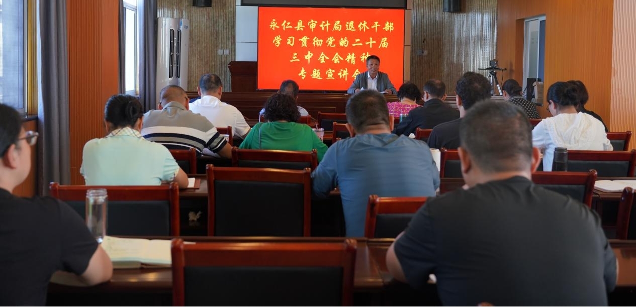 近日,永仁县审计局党组把学习党的二十届三中全会精神作为首要政治任务,在周一学习日定期学、党组理论学习中心组学习和“三会一课”集中学、日常生活自觉学、审计一线集体学等基础上,请退休老干部和在职审计干部、审计辅助人员一起学,局领导班子成员带头学,中层干部积极学,审计人员主动学,邀请县委“银发志愿宣讲团”老同志到审计局现场宣讲党的二十届三中全会精神,退休老干部和在职审计干部认真聆听,从课堂式的提纲讲解到“摆龙门阵”的具体事例,从十大以来每一次召开三中全会的重要意义到二十届三中全会取得的巨大变化,年轻干部在“故事中”看到了改革发展面临的新形势、新挑战,老干部们心情激动的重温了党的辉煌历史,老中青同堂学习党的二十届三中全会精神,“老同志传学、领导干部领学、全体审计干部相互促学督学”的良好学习氛围在审计机关悄然形成一道靓丽风景。