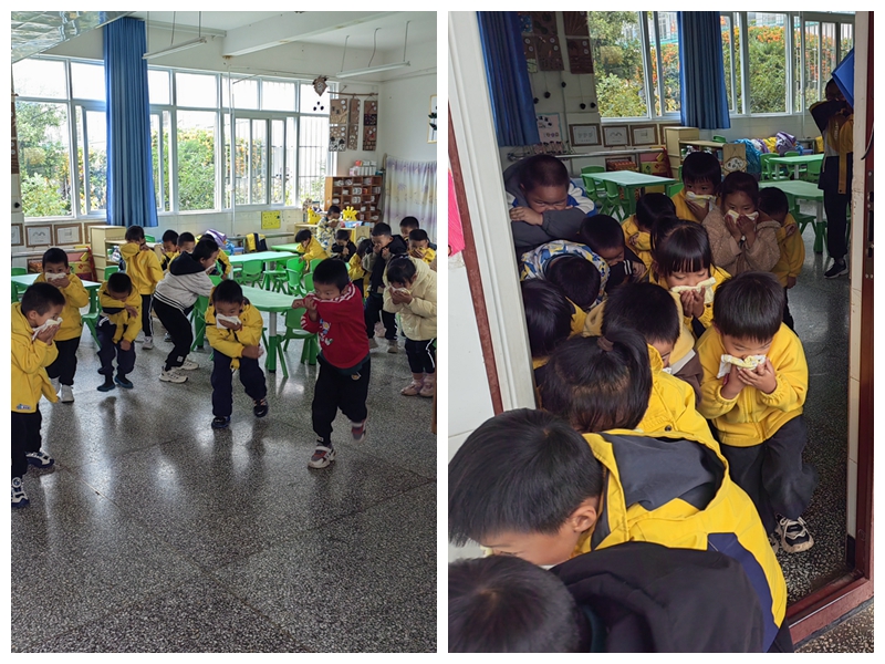 在疏散逃生演练中,随着警报声响起,各班小朋友在老师们的指挥下,用湿毛巾捂住口鼻,按照预案中的逃生疏散路线,迅速有序地撤离到安全地带。集结完毕,宣传员架起了火盆,演示灭火器的正确使用方法,小朋友们聚精会神、认真听讲,争先恐后上前实操体验。