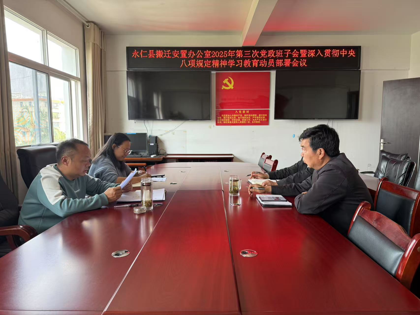 3月28日,永仁县搬迁安置办公室召开党政班子会议,学习贯彻习近平总书记关于深入贯彻中央八项规定精神学习教育的重要讲话和重要指示精神,传达党中央和省委、州委、县委相关部署要求,审议永仁县搬迁安置办公室开展深入贯彻中央八项规定精神学习教育任务清单,研究启动永仁县搬迁安置办公室学习教育工作。党组书记、主任陶先荣主持会议并作动员讲话,党组班子成员、全体党员参加会议。
