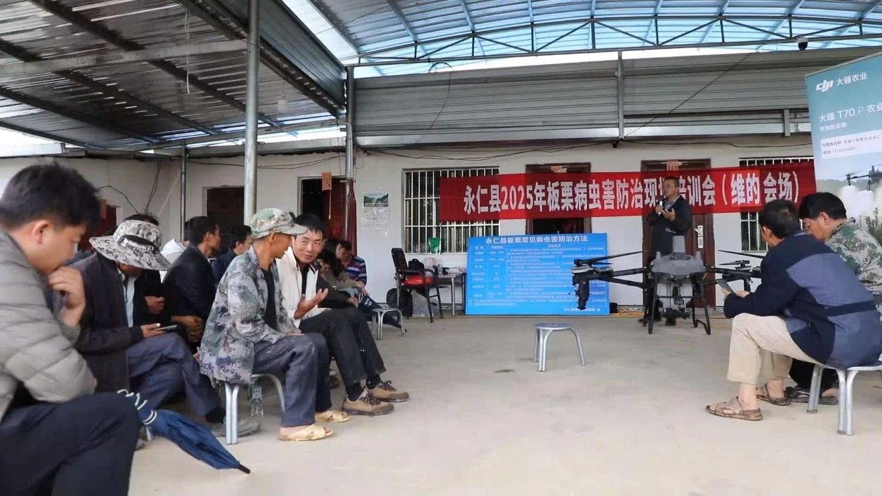 培训现场,林业技术专家结合永仁县实际情况和林农需求,对板栗病虫害发生种类、规律和防治方法进行细致讲解,并结合实际案例分析了传统防治方式的局限性。随后,伴随着一阵阵旋翼转动声,植保无人机在技术人员的操作下穿梭于板栗林上空,精准、均匀地喷洒农药,短短几分钟便完成了一大片区域的作业。