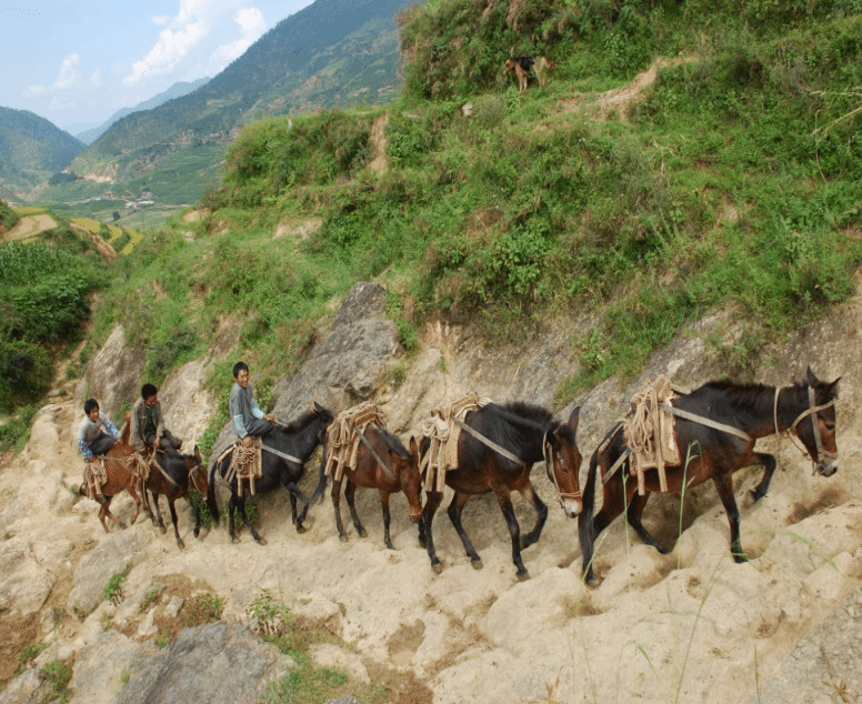 在直苴村委会比刀底村南2千米的宰嘎力山上,一段保存完好的古盐马驿道诉说着过往的商贸故事。驿道由砂石与泥土混合铺设,砂石路段凹凸不平,岩石路面上留存的马蹄印清晰可辨,仿佛能让人窥见千年前马帮穿梭、盐货流转的繁忙盛况。