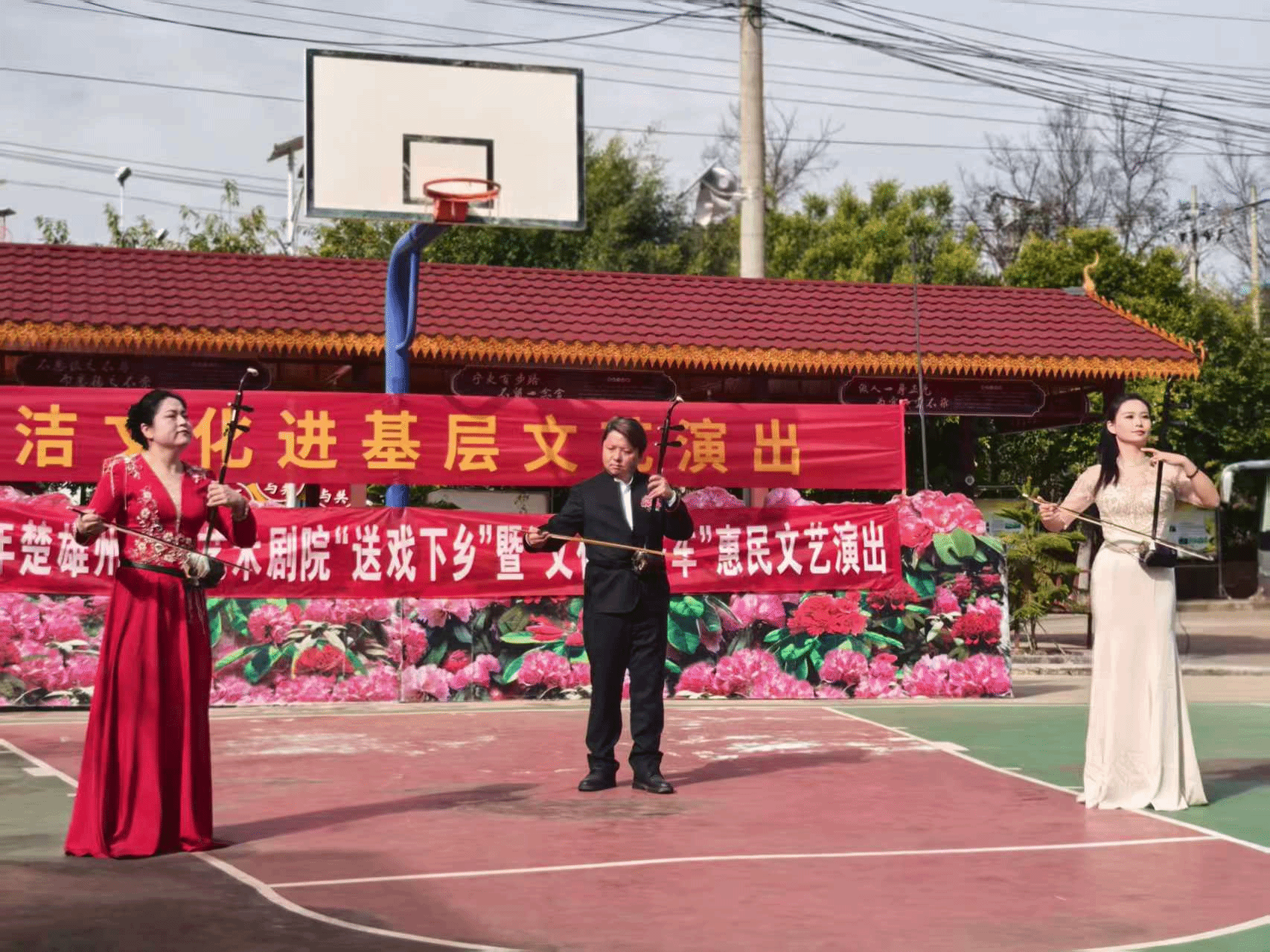 作为2025年“送戏下乡”永仁站的第二场演出,艺术团特别编排了兼具彝族、傣族、维吾尔族等多元文化元素的节目单。开场歌舞《春风十万里》由彝族歌手非明荣领衔,十二名舞者手持彩扇翩翩起舞,瞬间点燃现场气氛。琵琶演奏家周梓然演绎的《十面埋伏》创新融入大鼓和琵琶元素,赢得阵阵喝彩。