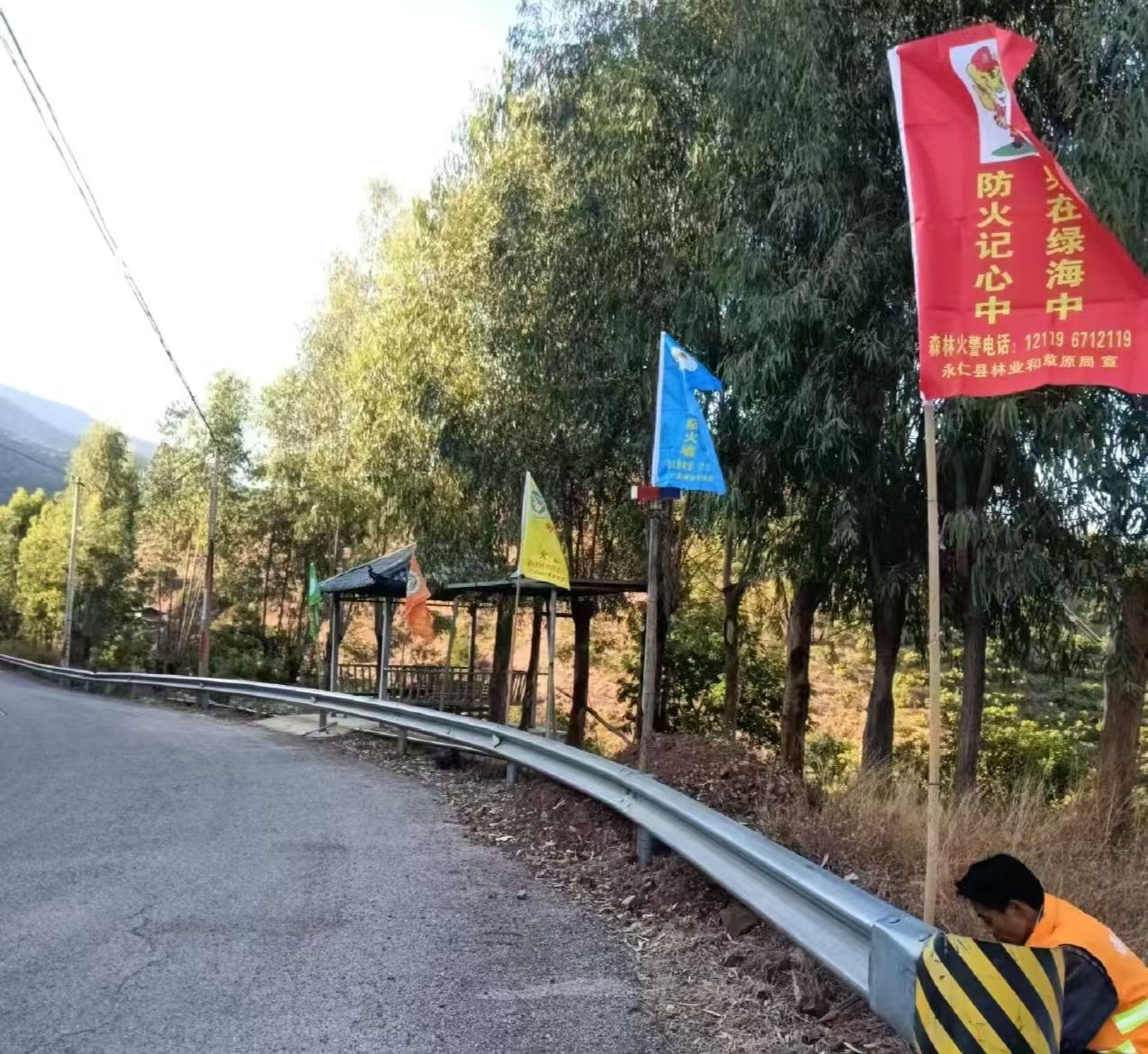 当前正值森林防火关键时期,在永仁县永兴傣族乡的青山绿水间,一簇簇鲜艳的“五彩旗”正迎风招展,格外引人注目。红、橙、黄、蓝、绿,明快的色彩跳跃在苍翠的林区要道、乡村路口和进山卡口,像一群无声的卫士,将“森林防火,人人有责”的叮咛,随风送入每一位过往者的眼中、心中。