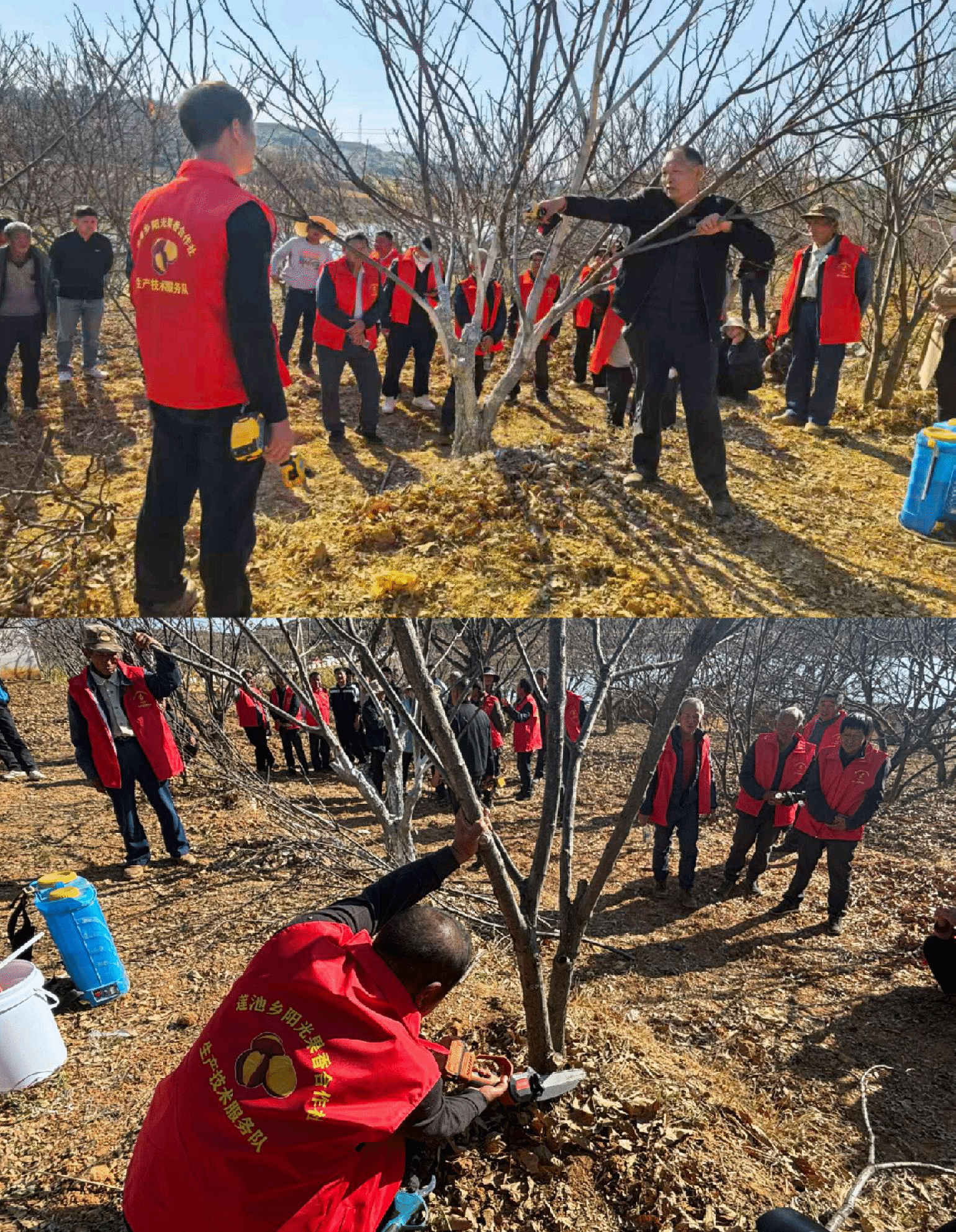 此次培训紧扣冬季板栗管理,抢抓管护黄金期。合作社社长、农业农村发展服务中心工作人员围绕整形修剪、病虫害综合防治、科学施肥、防寒抗冻四大核心技术,结合莲池乡气候与土壤条件,详细拆解关键要点:针对不同树龄板栗树,演示疏剪病虫枝、短截主枝的规范手法,强调剪锯口愈合剂涂抹技巧;指导农户清理果园落叶落果、刮除老翘皮并集中烧毁,讲解石硫合剂喷施时机与配比;示范环状沟施、条状沟施等施肥方法,明确有机肥与复合肥搭配比例;传授树干涂白剂配制(生石灰:石硫合剂:油)、树盘覆草保温等防冻措施。