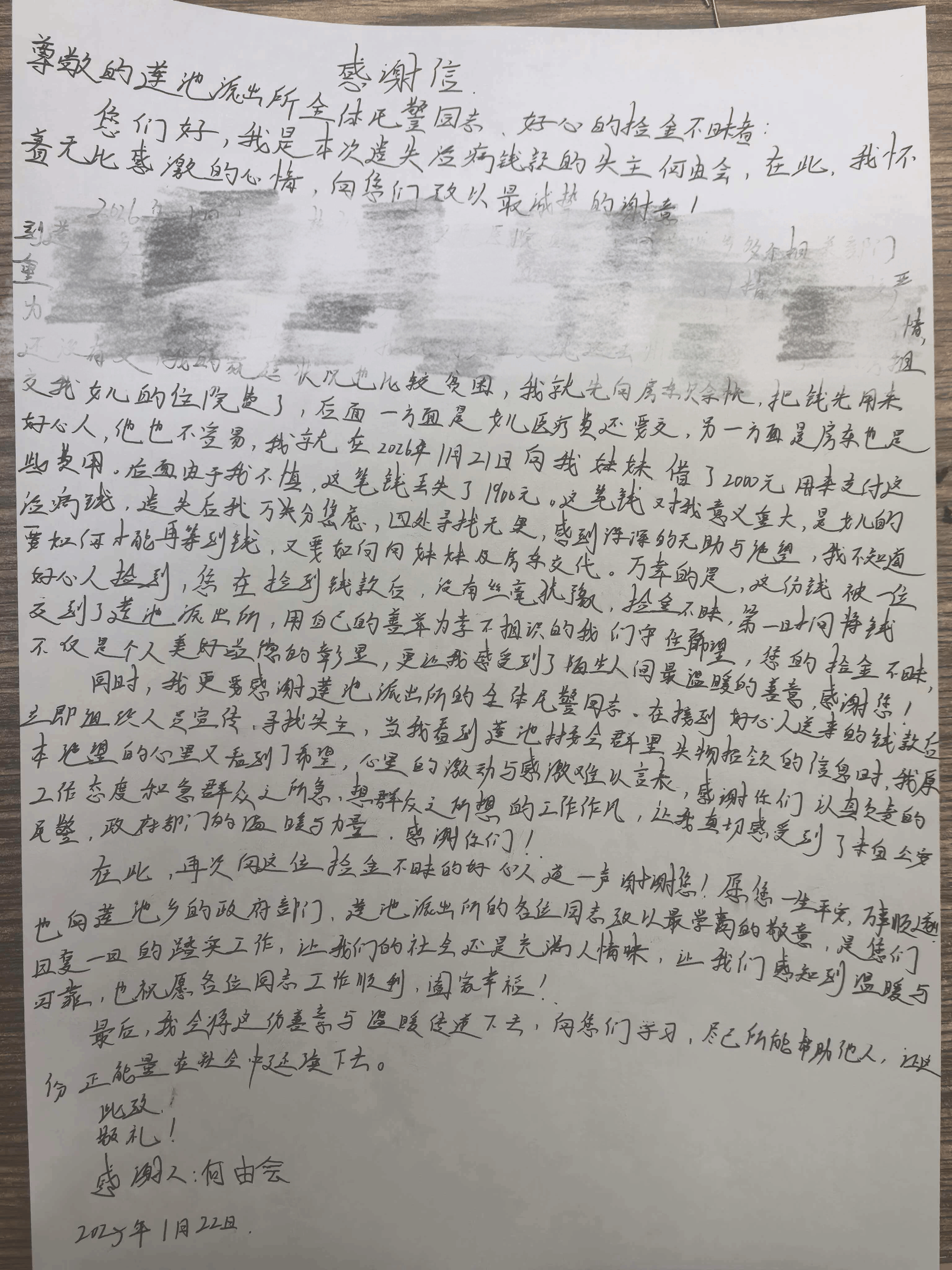 1月22日,经民警仔细核对信息后,失主何由会成功认领了这笔钱款。拿到失而复得的1900元,何由会激动得热泪盈眶,反复向民警、工作人员及拾金不昧者表达感谢。她坦言,这笔钱是自己向妹妹借来的救急钱,一方面要用于女儿的看病开支,另一方面还要结清拖欠房东的房租,丢钱后她心急如焚,四处寻找却无果,几乎陷入绝望。“这笔钱对我们家来说太重要了,没想到还能找回来。”何由会的话语里满是感激,她表示,正是这些人的善意与担当,解了她的燃眉之急,也让她在寒冬里感受到了浓浓的暖意。