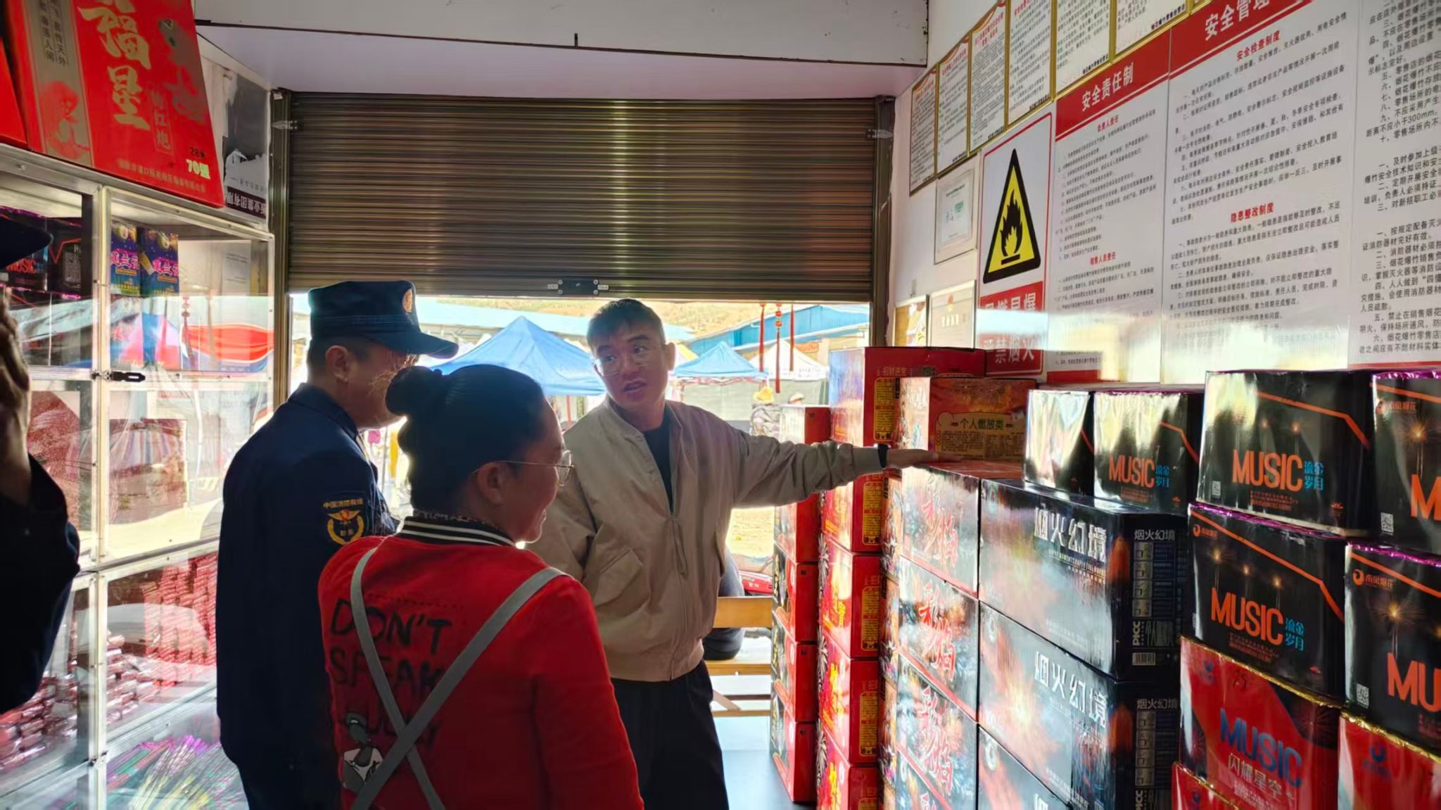 烟花爆竹销售点、超市、年货市场等人员密集场所,是队员们的检查重点。在超市,队员们全面检查消防通道、灭火器材、应急照明等设施,针对检查中发现的问题,实行“分类处置、闭环管理”,能现场整改的立行立改,需限期整改的建立台账,全程跟踪督办,确保隐患清零。“每个消防栓都要试压,每个应急灯都要确保能亮”,队长李山云反复叮嘱负责人落实主体责任。在烟花爆竹零售点,队员们严格核对经营资质,检查储存安全条件,叮嘱经营者严守安全规定,保障群众购买、燃放安全。