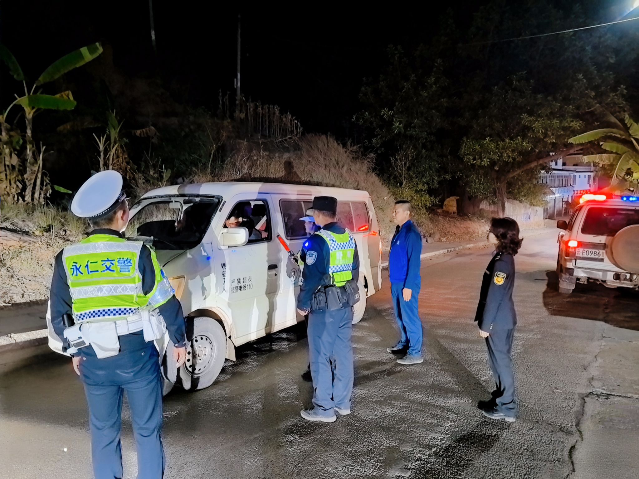 夜幕低垂,永仁县永兴傣族乡的山间村落逐渐安静,但在进出村的关键路口,几束警灯划破夜色,宛如守护乡村宁静的“灯塔”。连日来,为坚决防范化解农村道路交通安全风险,永仁县公安局主要领导带队,将办公室“搬”到路面上,组织县交管大队、永兴乡派出所,联合永兴乡综合行政执法队、农业农村发展服务中心、消防综合应急救援队以及交通安全“两站两员”劝导员等多方力量,下沉村寨、驻守路口,全面开展农村道路交通安全专项查缉行动,以联动共治的强大合力、严管厚爱的暖心举措,织密织牢乡村道路“平安防护网”。