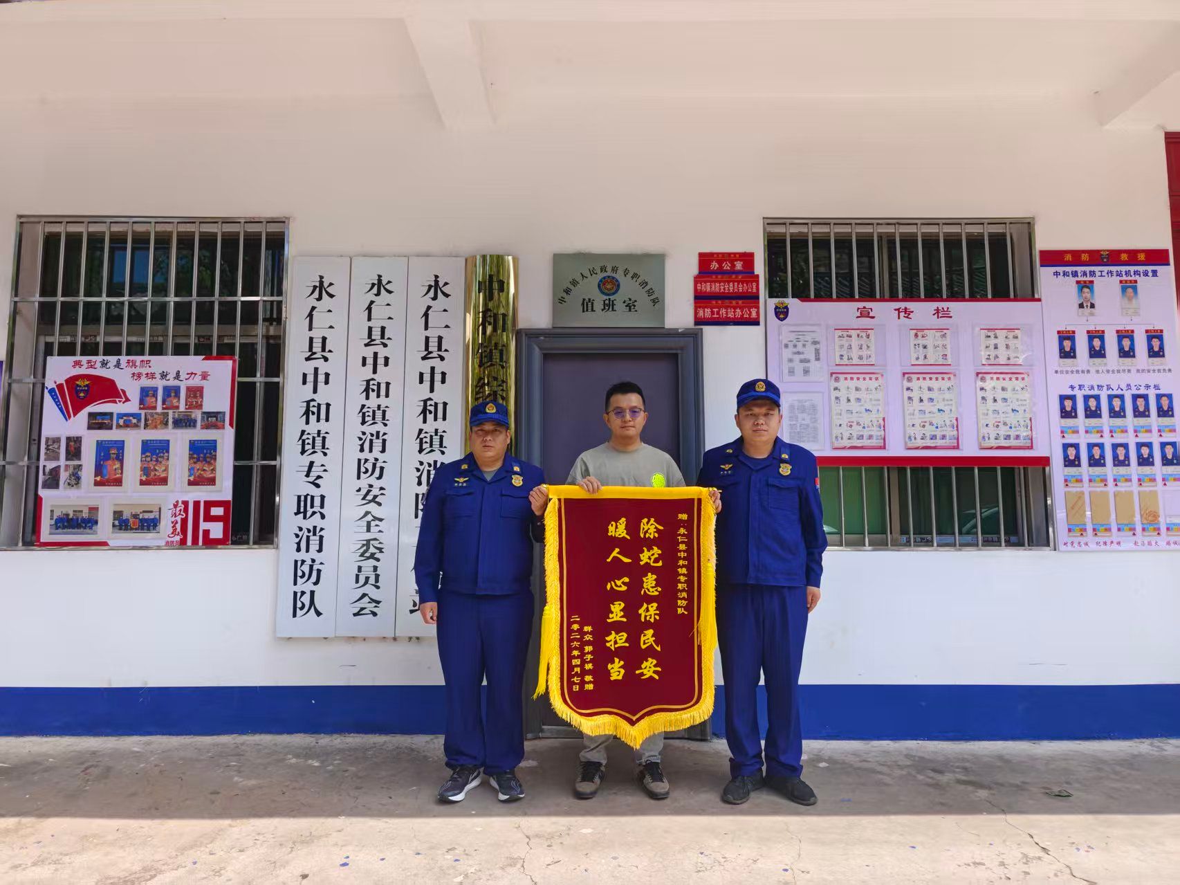 为了表达对消防救援人员最诚挚的谢意,群众特意定制了一面印有“除蛇患保民安, 暖人心显担当”的锦旗,亲自送到消防队,交到消防员手中,感谢他们及时出手相助,守护了自己的生命财产安全。