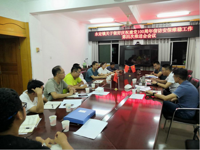 为坚决打赢庆祝建党100周年信访安保维稳攻坚战,镇党委政府于2021年6月28日晚20时在镇四楼会议室召开永定镇关于做好庆祝建党100周年信访安保维稳工作第四次推进会议,镇党委书记、镇人民政府班子成员、永定派出所所长、永定司法所所长、镇综治办全体人员等12名人员参会。