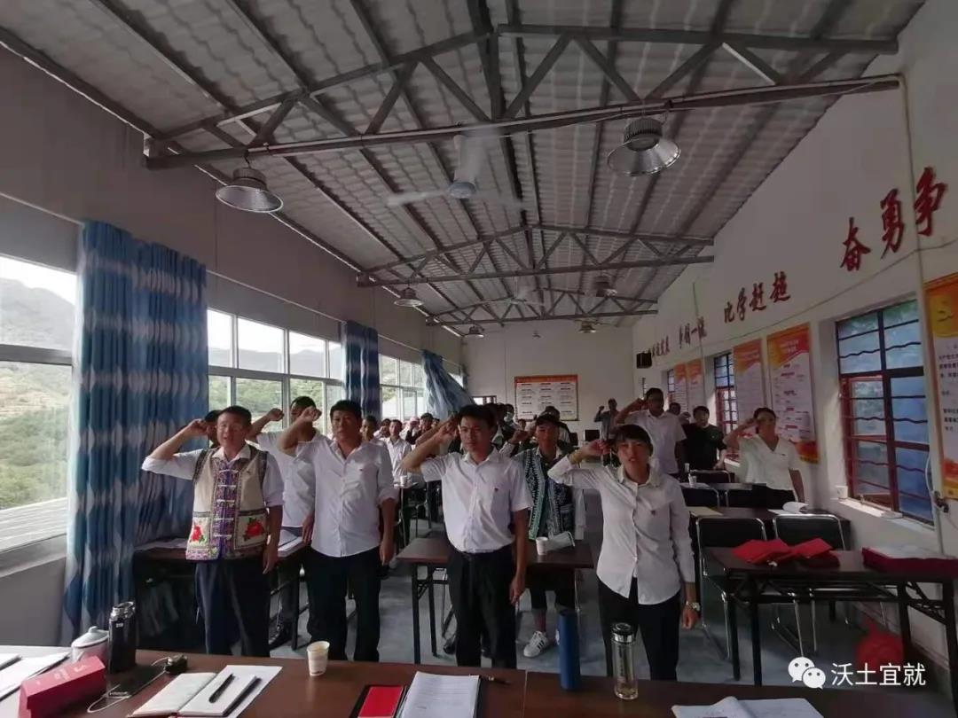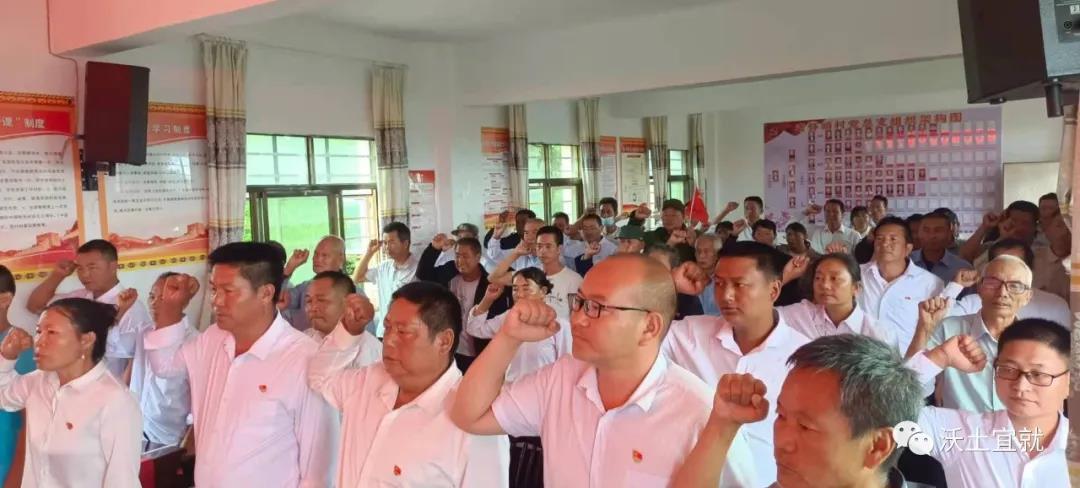 在鲜红的党旗下,各村书记带领全体党员庄严宣誓,重温入党誓词,一字一句吐露着对党的无限忠诚和倾心热爱。