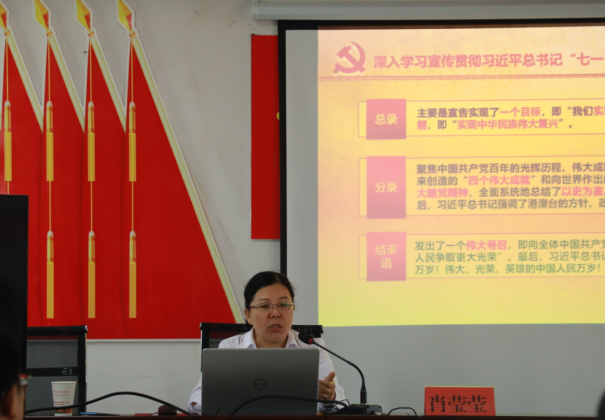宣讲中,肖莹莹老师围绕充分认识习近平总书记“七一”重要讲话的重大意义,深刻领会伟大建党精神是中国共产党的精神之源的思想内涵,深入学习领会党团结带领人民不懈奋斗的光辉历程和伟大成就等方面进行了全面透彻的讲解,宣讲内容系统丰富、深入浅出,是一次既生动又深刻的党 史 教 育、理论教育,对维的上下学习好、贯彻好、宣传好习近平总书记“七一”重要讲话精神,具有十分重要的促进作用。