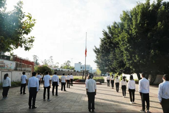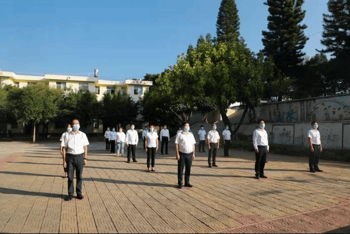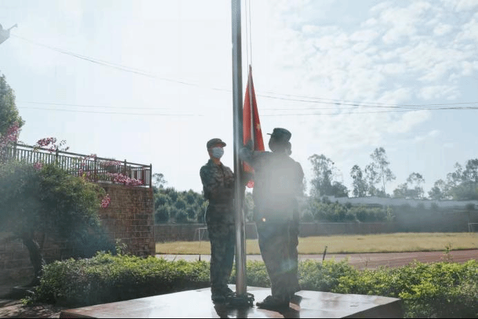 仪式开始,全体干部职工统一着装,汇聚在维的乡中心小学教学楼前整齐列队,伴随着蓬勃的朝阳,伴随着义勇军进行曲奋进激昂的旋律,全体人员高唱国歌,向冉冉升起的五星红旗行注目礼,表达对祖国最真挚的祝福。