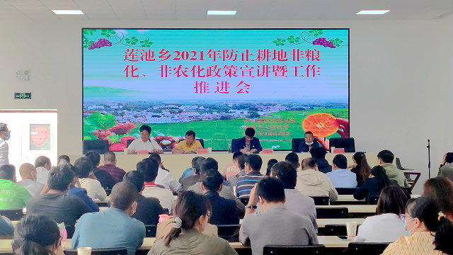 为认真贯彻落实国家关于加强耕地保护、保障粮食安全的决策部署。莲池乡认真落实相关政策,毫不放松耕地保护、保障粮食安全,确保粮食稳定供应,实现“农民增收、农业增产、农村稳定”。10月28日,莲池乡召开了防止耕地“非粮化、非农化”政策宣讲暨工作推进会,全乡干部职工、各村委会“四职”、各村土地专管员、村民小组长150余人参加此次会议,会议邀请县国土资源局、农业农村局领导,各站所长给予相关法律法规、业务培训讲解,让全体乡村组干部得到全方位能量补充。