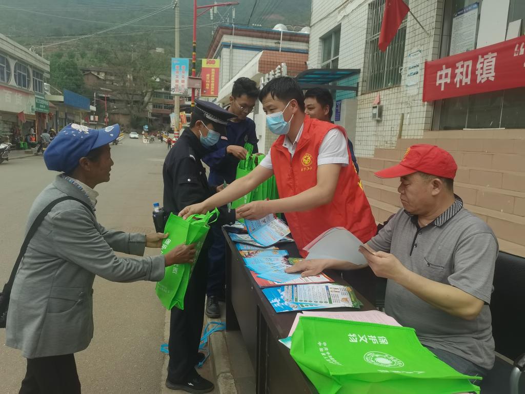 “线下”,4月15日中和镇组织综治办、安监办、派出所、市场监督管理所、农业农村服务中心、社会保障和为民服务中心、文化和旅游广播电视体育服务中心、林业和草原服务中心等部门在中和集镇区面向群众开展“4·15全民国家安全教育日”宣传活动。活动现场,工作人员通过悬挂横幅、发放宣传资料、现场讲解等方式,向群众宣传普及国家安全知识。同时工作人员还向来往群众普及防范电信网络诈骗、生产安全、消防安全、食品安全、保险缴纳等政策和知识。当日,共发放宣传资料360份,接受群众咨询50余人次。